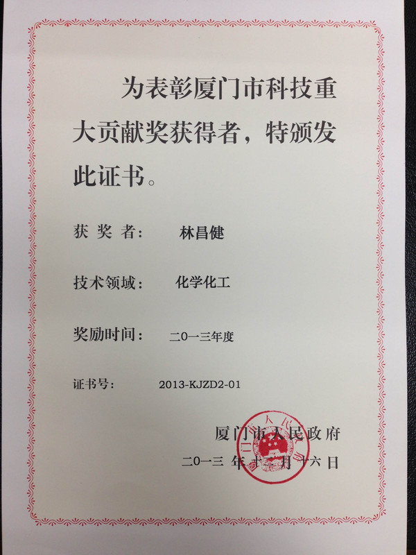 11. 荣获2013年厦门市科技重大贡献奖,厦门市政府;(个人)