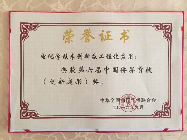 15. 电化学技术创新及工程应用,获2016年中国侨联第六届贡献奖(创新成果奖);(个人)