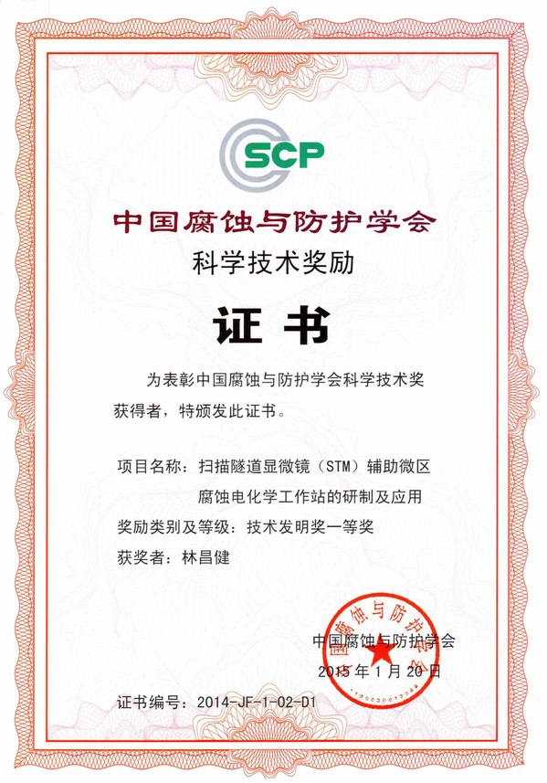 13. STM辅助微区腐蚀电化学工作站,获2014年中国腐蚀与防护学会技术发明一等奖;(排名第一)