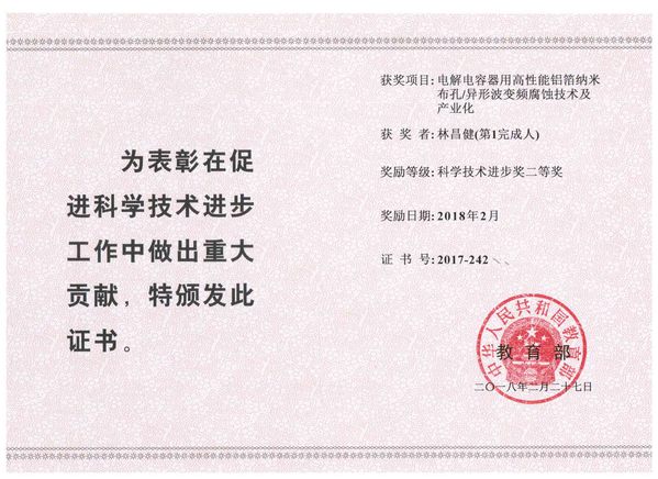 17. 电解电容器用高性能铝箔纳米布孔/异性波变频腐蚀技术及产业化,获2017年国家教育部科技进步奖二等奖;(排名第一)