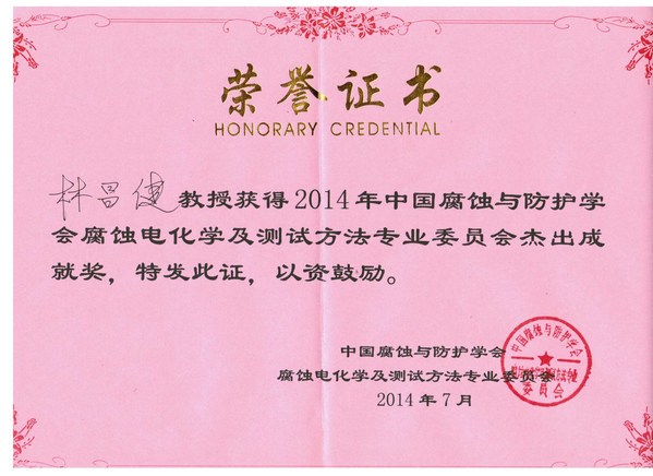 12. 荣获2014年中国腐蚀电化学杰出成就奖,中国腐蚀与防护学会腐蚀电化学及测试专业委员会;(个人)