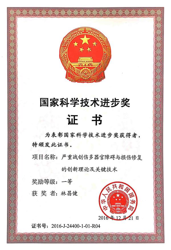 16. 严重战创伤多器官障碍与损伤修复的创新理论及关键技术,获2016年国务院国家科技进步一等奖;(排名第四)