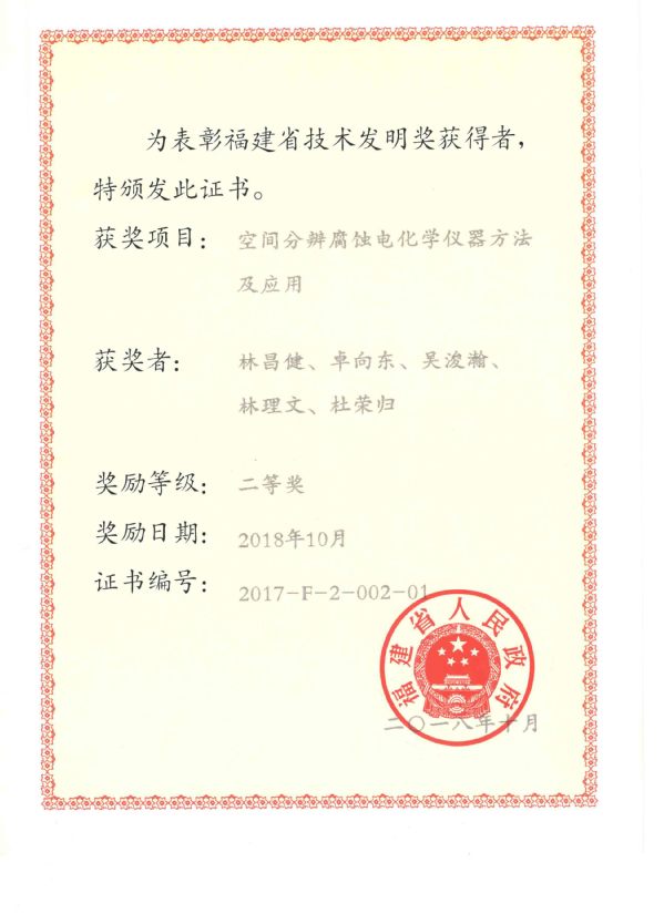 18. 空间分辨腐蚀电化学仪器方法及应用,获2017年福建省科学技术发明奖二等奖;(排名第一)