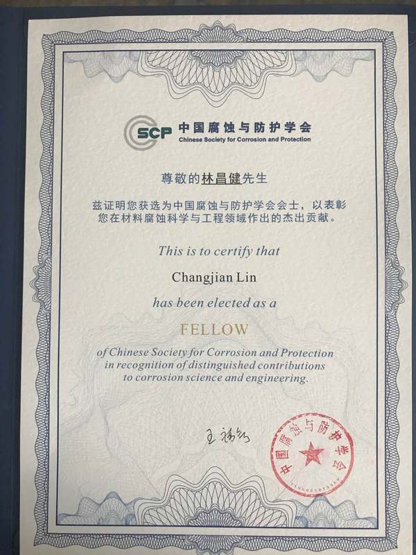 24. 当选中国腐蚀与防护学会首届会士,2019年10月;