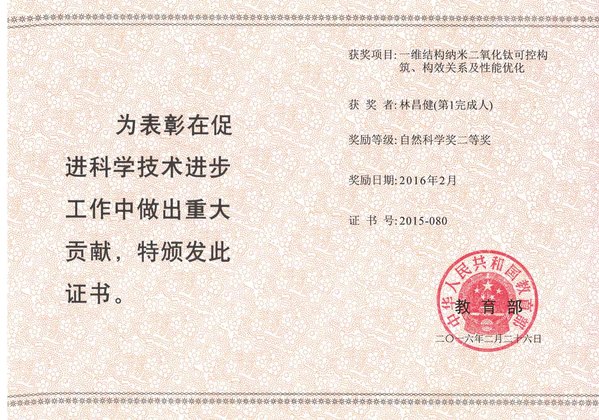14. 一维结构纳米TiO2可控构筑、构效关系及性能优化,获2015年国家教育部自然科学奖二等奖;(排名第一)