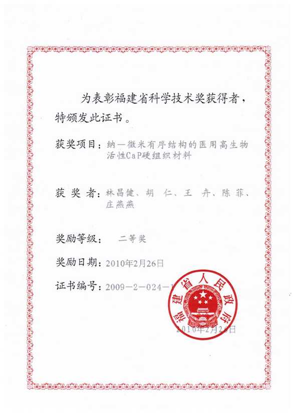 8. 纳-微米有序结构的医用高生物活性CaP硬组织材料, 获2009年福建省政府科技进步奖二等奖;(排名第一)