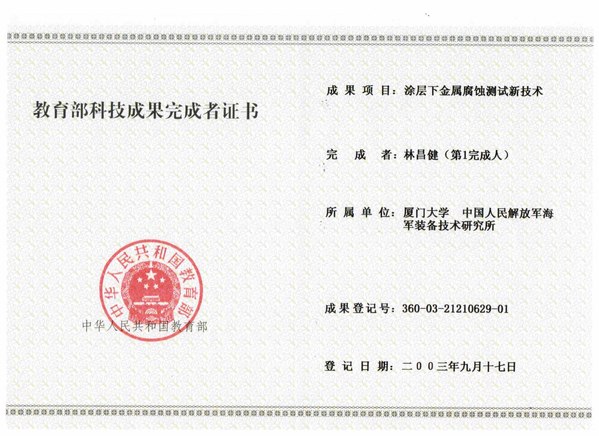 6. 涂层下金属腐蚀测试新技术,获2003年教育部推荐国家科技奖自然科学奖二等奖;(排名第一)