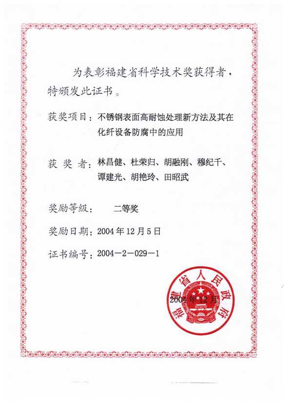 7. 不锈钢表面耐蚀处理新技术在化工防腐中的应用,获2004年福建省科技发明二等奖;(排名第一)