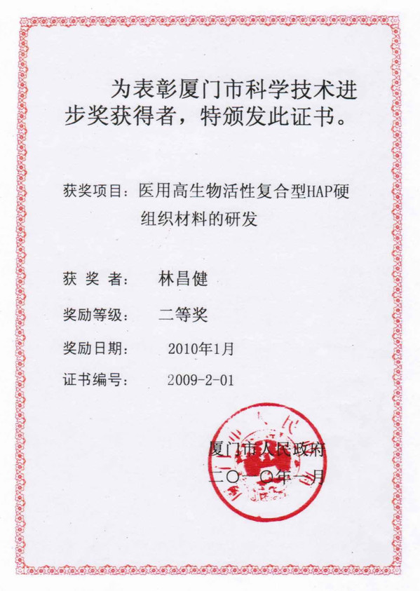 9. 医用高生物活性复合型HAP硬组织材料的研发, 获2009年厦门市政府科技进步奖二等奖;(排名第一)