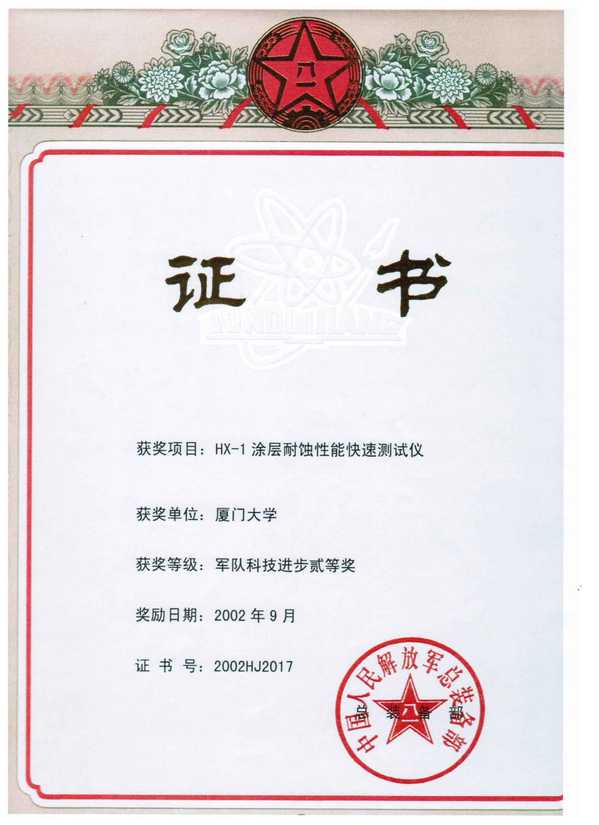 5. 便携式舰船涂层耐蚀性快速测试仪,获2002年军队科技进步二等奖;(排名第二)